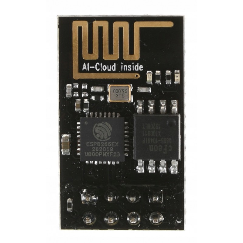 Ai-Thinker ESP8266 ESP-01 ESP-01 to z pewnością najmniejszy moduł z serii znakomitych mikroprocesorów ESP8266. Jego wymiary pozwolą na umieszczenie go w każdej obudowie. Dwa piny GPIO pozwolą na sterowanie urządzeniami zewnętrznymi. Dzięki obsłudze sieci Wi-Fi moduł ESP-01 doskonale odnajdzie się w jako element naszej sieci IoT oraz pomocny w sterowaniu inteligentnym domem. Oczywiście wszystko przy wsparciu środowiska Arduino. Uwaga! Umiejscowienie pinów ESP-01 nie pozwala na włożenie modułu do płytki stykowej. Aby poprawnie zaprogramować ten układ konieczne jest podłączenie zasilania 3.3V oraz pinów portu szeregowego (RX, TX). Istnieje również możliwość programowania ESP-01 poprzez Arduino UNO / NANO.